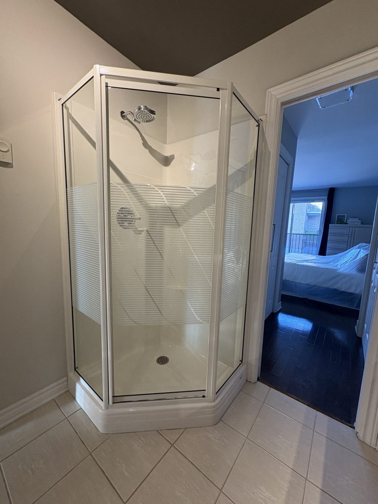 Avant la rénovation, cette salle de bain était fonctionnelle, mais sombre et dépassée. La douche fermée, les matériaux vieillissants et l’aménagement peu optimisé donnaient une impression d’espace restreint et peu accueillant.
