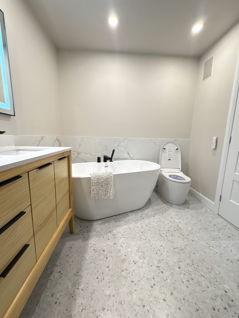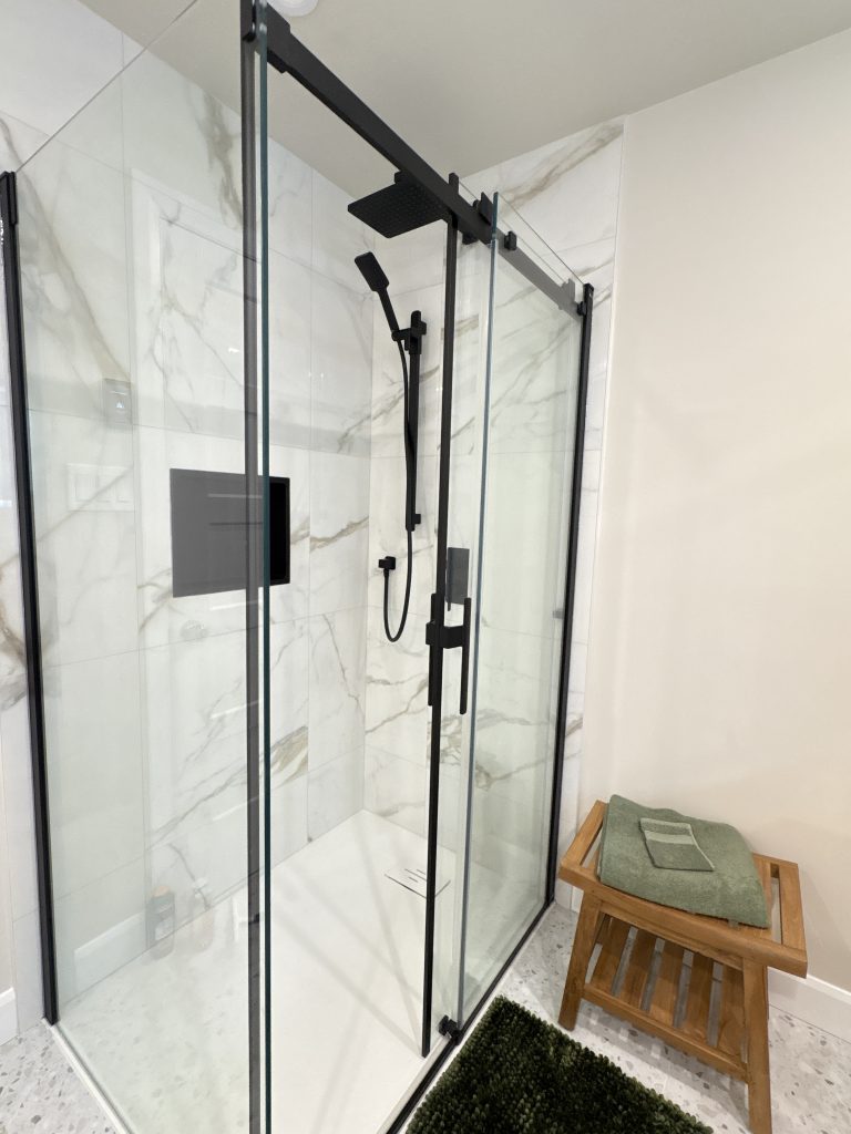 La douche vitrée au design minimaliste, la robinetterie noire mate et les matériaux durables ont été choisis pour leur esthétique intemporelle et leur facilité d’entretien — un point clé pour réduire les coûts à long terme. La toilette haute technologie, discrète mais innovante, renforce le positionnement premium du logement et justifie un loyer plus élevé.